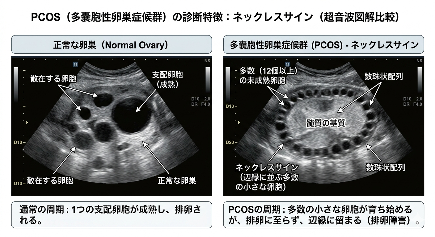 超音波検査において、下のような卵胞が数珠状に並んで見える「ネックレスサイン」が確認されるのが診断上の大きなポイントです。